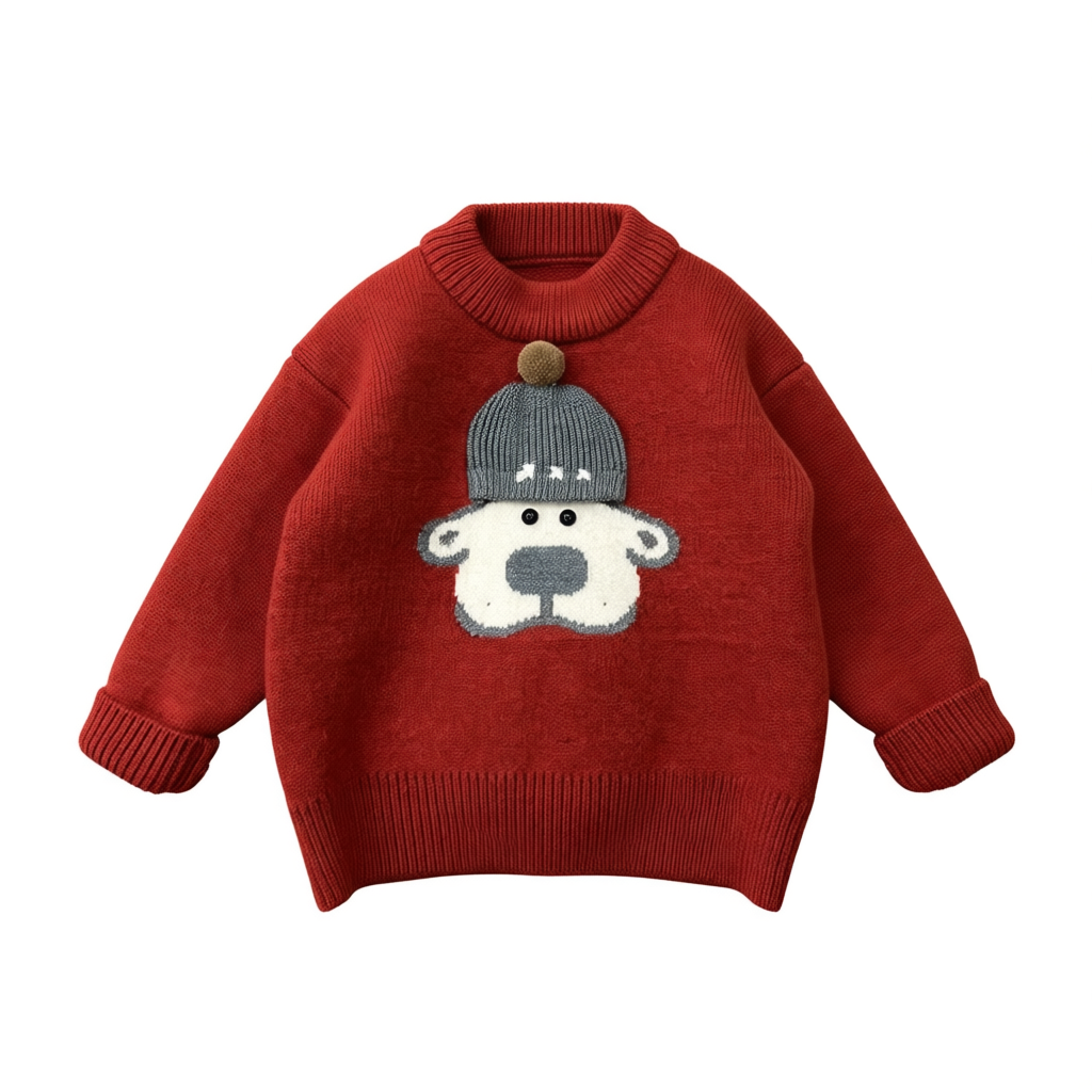 Boys Red Knit Fleece Sweater Round Neck Top with Dog-in-Hat Decor